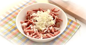 Мясной фарш смешайте с рубленным репчатым луком, приправьте по вкусу солью и молотым перцем.