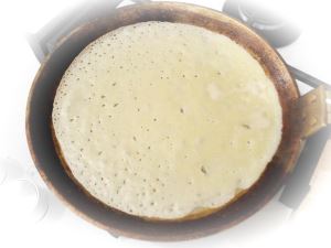 Зачерпните тесто (примерно половину половника). Свободной рукой возьмите сковороду за ручку и приподнимите один из её краёв. Одновременно с поднятием бортика начинайте выливать тесто, стараясь попасть в центр. Как только первые капли теста попали на поверхность сковороды, начинайте плавно поворачивать её по окружности, чтобы тесто равномерно распределилось по поверхности тоненьким слоем.
