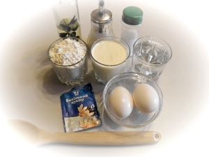 Для приготовления этого блюда нам потребуется: молоко, кипяток, яйца куриные, мука, сахар, сода, соль, масло растительное.