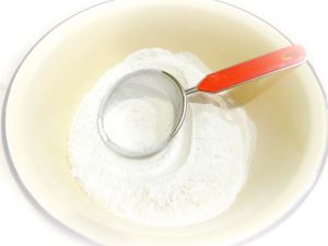 Добавьте в миску просеянную муку, одновременно помешивая ложкой, а также неполную чайную ложку соды.