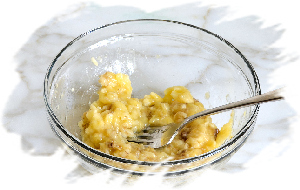 Возьмите некрупный банан. Очистите и разотрите его в такой же миске.