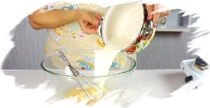 Затем в миску влейте нагревшийся кефир и снова перемешайте.