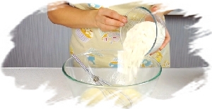 Добавьте в миску треть муки, хорошенько её вмешайте, чтобы не осталось комочков. Затем добавьте ещё треть муки и снова вмешайте. И так три раза.