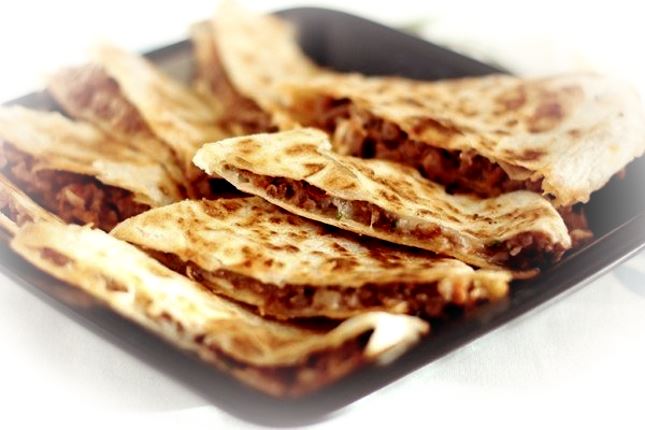 Накрыть начинку второй тортильей, быстро обжарить (около 1 минуты), перевернуть и снова быстро обжарить. Лепёшки с начинкой должны стать хрустящими и румяными.