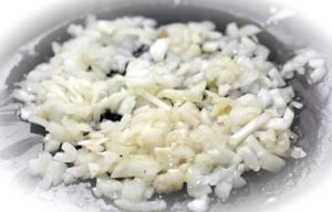 Репчатый лук мелко нарезать и немного обжарить на кукурузном масле пару минут до прозрачности.