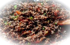 К луку добавить говяжий фарш. Постоянно помешивая, прогреть его в течение семи минут.