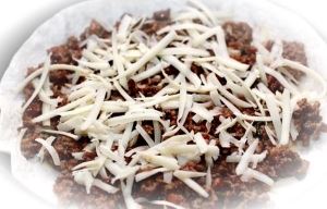 Разогреть сухую сковороду, выложить на неё тортилью, посыпать её тёртым сыром, выложить мясную начинку, снова покрыть слоем сыра.
