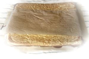 Быстро, пока бисквит горячий, освобождаем его от бумаги, на которой выпекали.