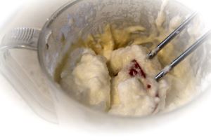 Во взбитые с сахаром желтки вмешиваем миксером на низкой скорости муку с ванильным сахаром. Тесто получается достаточно мягким.