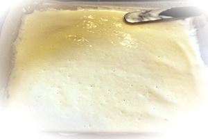 Осторожно и как можно равномернее стараемся распределить тесто по всей поверхности нашего противня с помощью специальной длинной лопаточки.