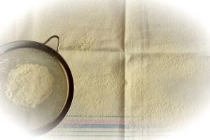 Расстилаем на рабочей поверхности чистое льняное полотенце, равномерно припыляем его мукой.