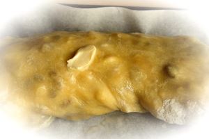 Смазываем пласт теста размягчённым сливочным маслом (100 г), оставляя нетронутой полосу теста около 10 см шириной (по длинной стороне пласта). Это впоследствии будет шов штруделя.