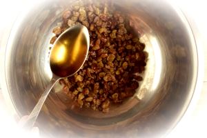 Тщательно вымытый и просушенный изюм заливаем двумя столовыми ложками коньяка.