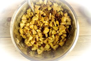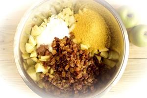 Добавляем к яблокам сахар, ванильный сахар, корицу, крахмал, панировочные сухари и отжатый изюм.