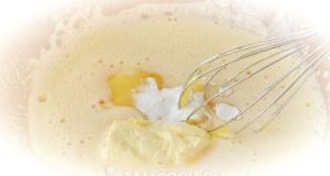 Постепенно добавляя муку в смесь замесить тёплое мягкое тесто. Сначала замешивать ложкой, а когда тесто немного остынет, продолжить замес руками.