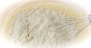 Продолжая греть смесь, добавить в неё 1/3 объёма просеянной муки и непрерывно мешать.
