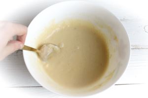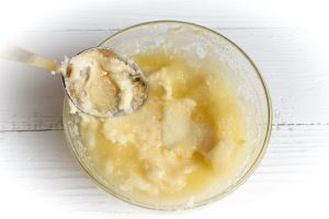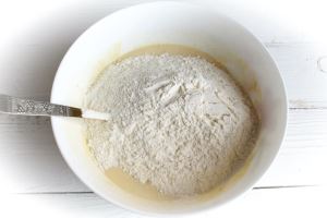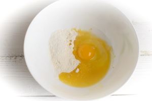 В это время в другой ёмкости соединяем растопленное сливочное масло, яйцо и две ложки муки.