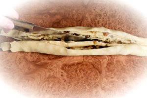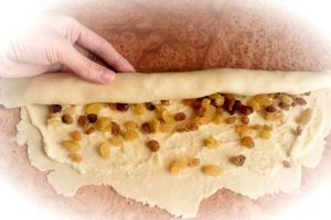 Начиная с длинной стороны, сворачиваем тесто в плотный рулет.