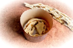 Затем выкладываем полоски теста в форму для кулича, сворачивая по кругу. Сначала – одну.