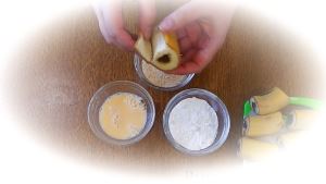Очищаем каждый кусочек, обваливаем в муке, яйце и печенье.