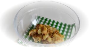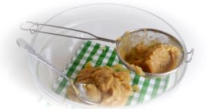 Затем аккуратно снять с яблок кожуру и перетереть всю массу через мелкое сито. Выход готового пюре должен составлять 200 г.