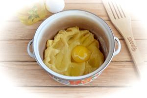 Хорошо остудите тесто до комнатной температуры. Вводите по очереди в тесто яйца, вымешивайте миксером на малых оборотах или ложкой до гладкости.