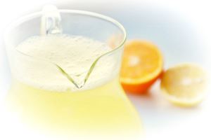 Выдавить сок из очищенных лимона и апельсина, всё смешать и процедить через сито.