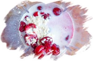 После этого отправляем в чашу блендера йогурт и вымытую вишню без косточек.