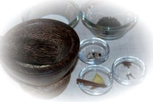 Кардамон и перец растираем в ступке. Имбирь можно натереть на тёрке.