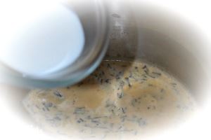 Наливаем в сотейник 200 мл воды, добавляем половину сливок 10% и нагреваем почти до кипения.