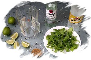 Для того чтобы приготовить «Мохито», нам понадобятся охлаждённые ром и тоник, лайм, листочки свежей мяты, коричневый сахар, а также лёд в кубиках.