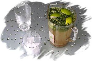 Разливать коктейль в стаканы следует через мелкое сито, чтобы в них не попала зелень.