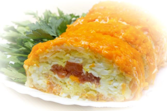 Салат «Царский рулет» с красной рыбой. Пошаговый рецепт приготовления с фото.