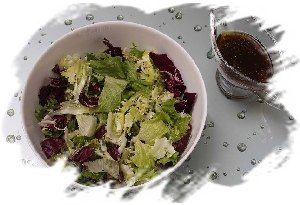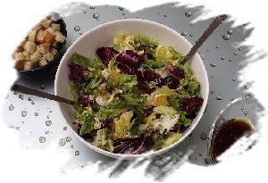 В большой салатник выложить крупно порезанные листья салата и сбрызнуть их свежеприготовленной заправкой.