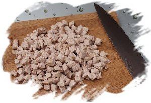 Готовую индейку вынуть из бульона, остудить и нарезать небольшими кубиками.