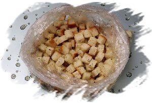 Нарезанный хлеб положить в целлофановый пакет и залить туда же приготовленное ароматное масло.