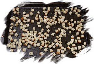 Пока варится индейка, можно заняться приготовлением домашних пшеничных сухариков. Для этого белый хлеб порезать небольшими кубиками.