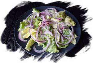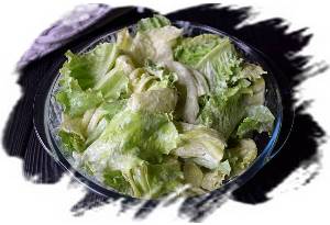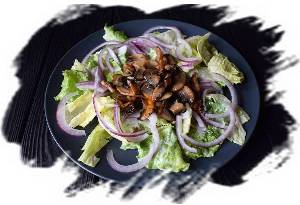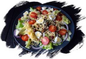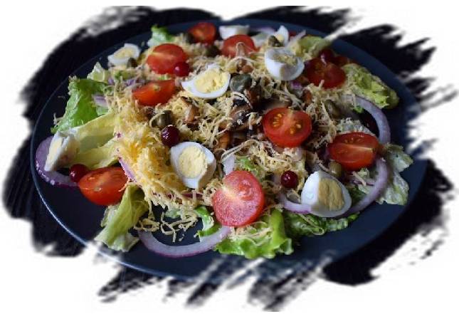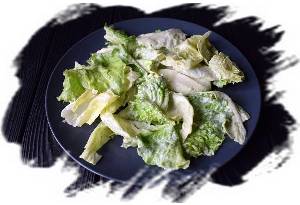 Салат готов! Сразу подаём к столу – не настаиваем, иначе листья салата потеряют привлекательность и внешнюю, и вкусовую.