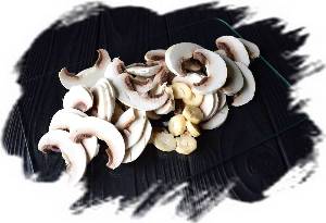 Шинкуем шампиньоны на тонкие слайсы – шляпки отдельно, ножки отдельно.