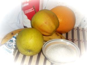 Подготовьте все необходимые ингредиенты: яблоки (кислые), бананы, апельсин, сливки молочные, сахар.