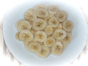 Бананы очистите от кожуры, нарежьте на кружочки. Выложите на плоскую тарелку первым слоем.
