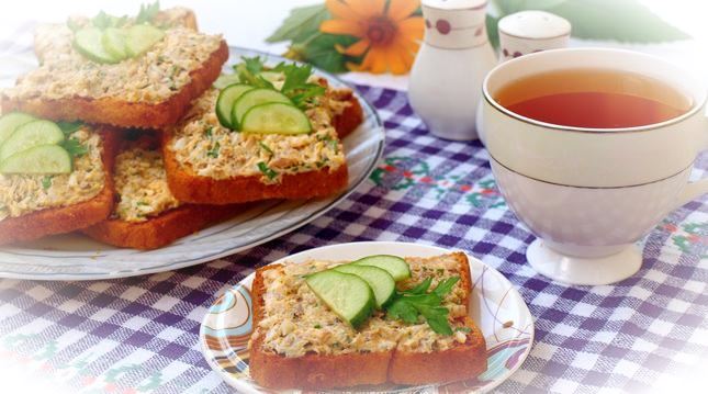 Намажте хлеб подготовленной массой и можно сразу подавать к столу.
