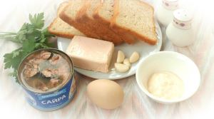 Для приготовления бутербродов следует подготовить следующие продукты: тостовый хлеб, банку сайры, плавленый сырок, яйцо, чеснок, майонез, зелень петрушки, соль и перец.