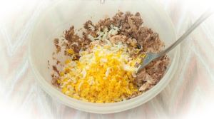 Добавьте плавленый сырок и также разомните его вилкой. Натрите на тёрке яйцо и соедините его с сайрой и сыром.
