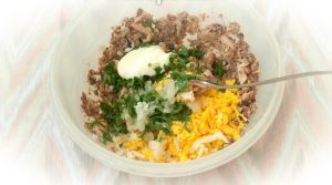 Измельчите петрушку и пропустите чеснок через пресс, соедините их с общей массой. Добавьте майонез по желанию.