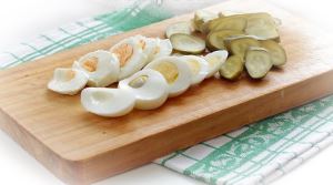 Маринованные огурчики тонко нарезать наискосок, яйца отварить, очистить и нарезать кольцами.