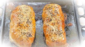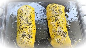 Выложить рулеты на смазанный подсолнечным маслом противень. Смазать сверху разболтанным яйцом, посыпать кунжутом (по 2 ст.л. белого и чёрного, по желанию).