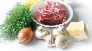 Для приготовления рулета потребуется свиная шея, шампиньоны, лук репчатый, сыр твёрдый, подсолнечное масло, чеснок, укроп свежий, соль и перец чёрный молотый.