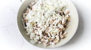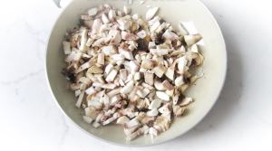 Шампиньоны почистить, помыть и мелко нарезать. Выложить на сковороду.