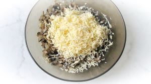 К жареным шампиньонам и луку добавить тёртый сыр.
